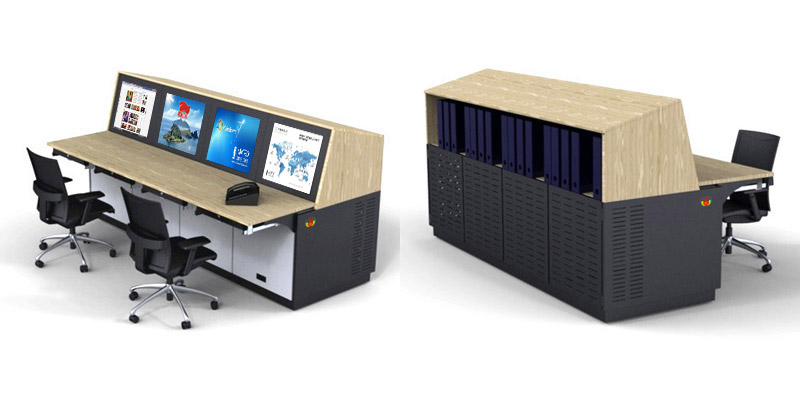 保安監控操作臺采用全封閉式設計,操作臺面用于操作人員進行書寫和鍵盤操作,而上部空間除了可以放置液晶顯示器,也可以在背部放置文件夾或其它物品,從而更大化利用空間。